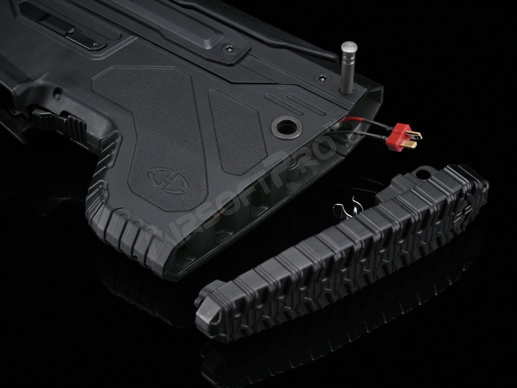 - Programozható tüzelési mód (burst/bináris), DMR lehűlés, cadence beállítás, dugattyú előfeszítés, alvó üzemmód, aktív fék és akkumulátor védelem. Mechanikus reteszeléssel és a mosfetek hővédelmével is rendelkezik.