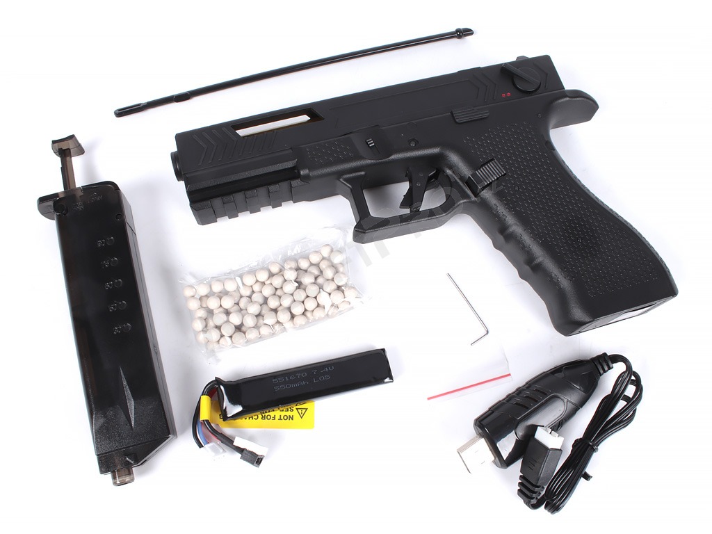 A csomagban található: pisztoly, tár, akkumulátor, töltőkábel (USB), gyorstöltő és törlő.