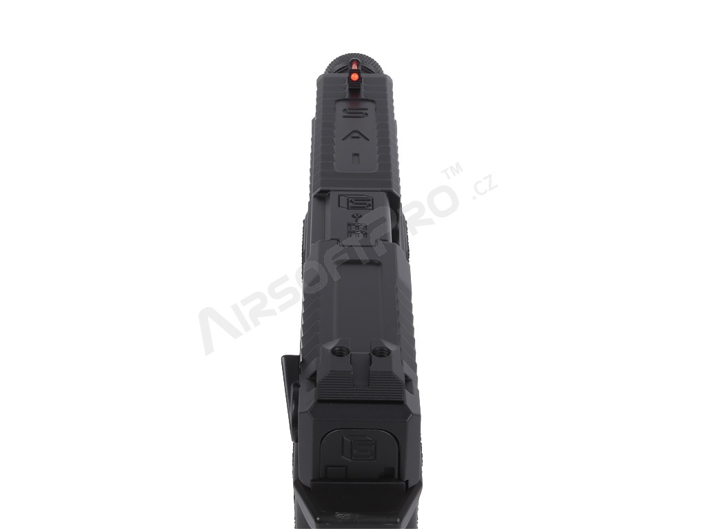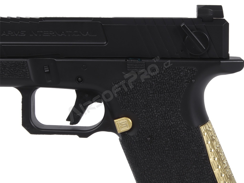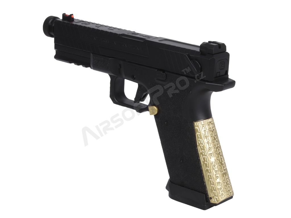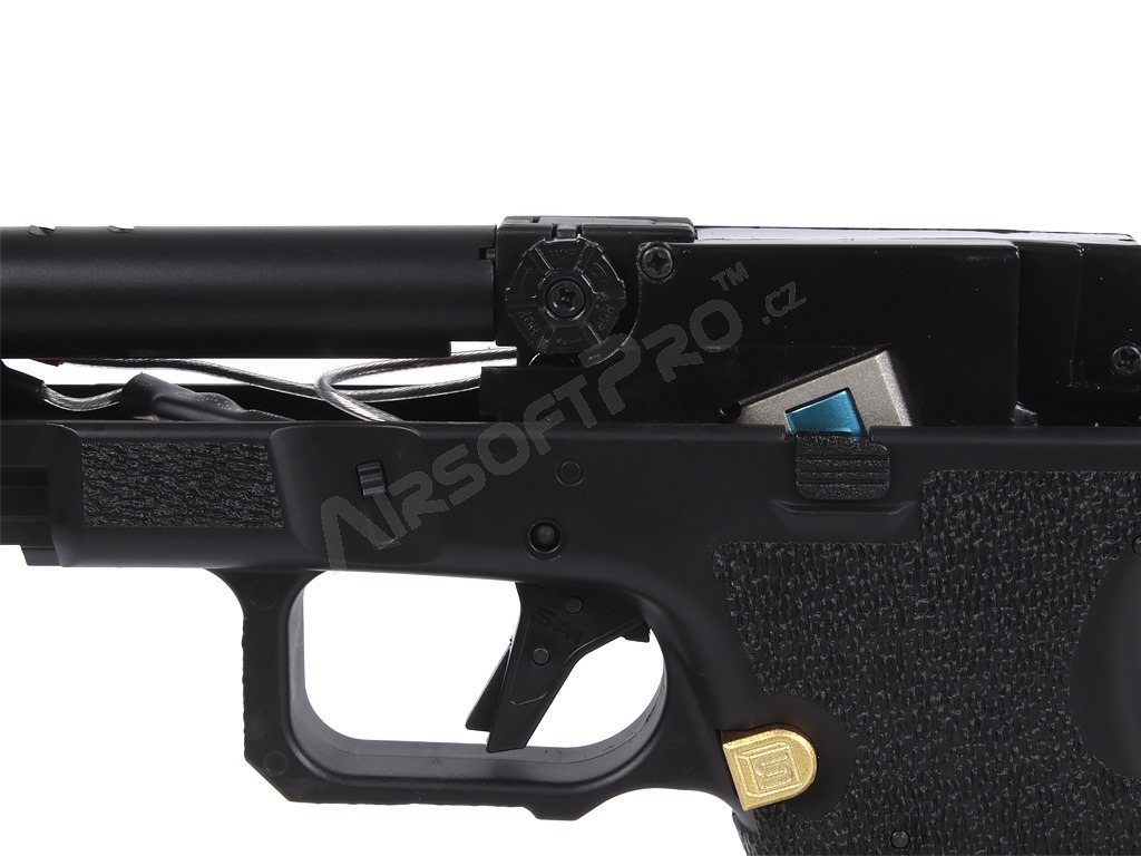 A test fém és polimer részeket kombinál - polimer váz, továbbfejlesztett ergonómiával és agresszív markolat textúrával a biztos fogás érdekében. A dizájnt arany díszítőelemek egészítik ki, amelyek kiemelik a "Blue Edition" megjelenést. A fegyver műanyag szárral és valósághű domborítással rendelkezik a vázon és a csúszdán. A menetvédő alatt 14 mm-es bal oldali menet található. A célzókészülék fényvezető.