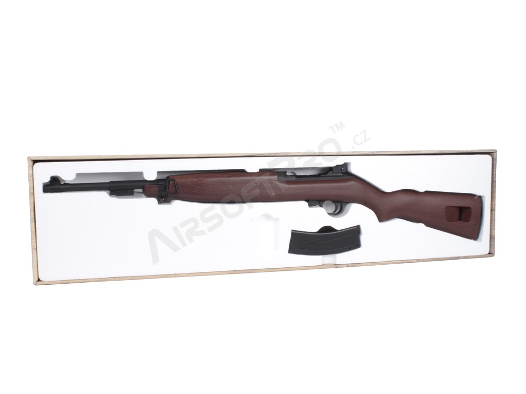 M1 karabély története: Az M1 karabiner (United States Carbine, Caliber .30, M1) egy könnyű, öntöltő karabiner, amely a második világháború alatt gyorsan alapfelszereléssé vált az amerikai katonák számára. Egyszerűsége, könnyű súlya és kompakt kialakítása népszerűvé tette a koreai és a vietnami háborúban; kifejlesztették a teljesen automata üzemmóddal (M2) vagy kiegészítő infravörös célzókészülékkel (M3) ellátott változatokat is. Sok karabéllyal ellentétben az M1-et önálló rendszernek tervezték, és széles körben elterjedt a katonai, rendőri és polgári szektorban. Ez a replika a klasszikus karabiner megjelenését hozza el az airsoft világába - ihletett, nem pontos történelmi másolat.