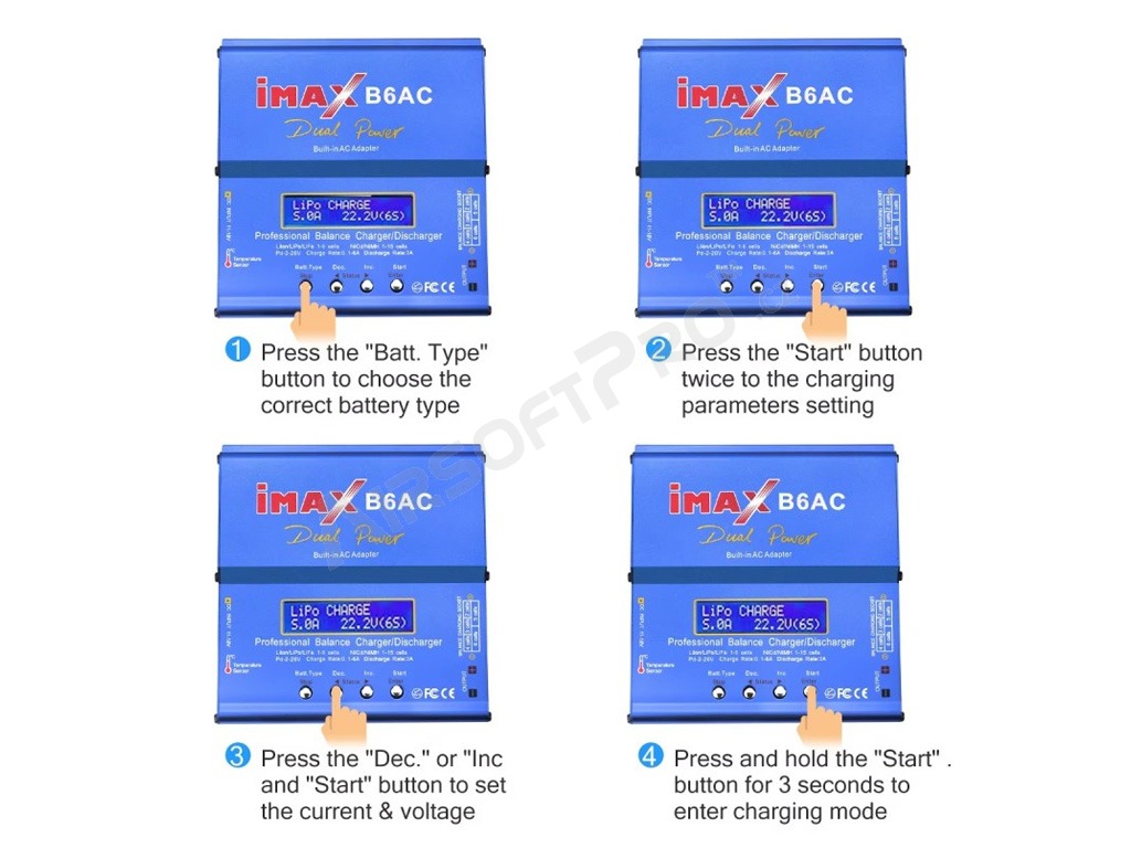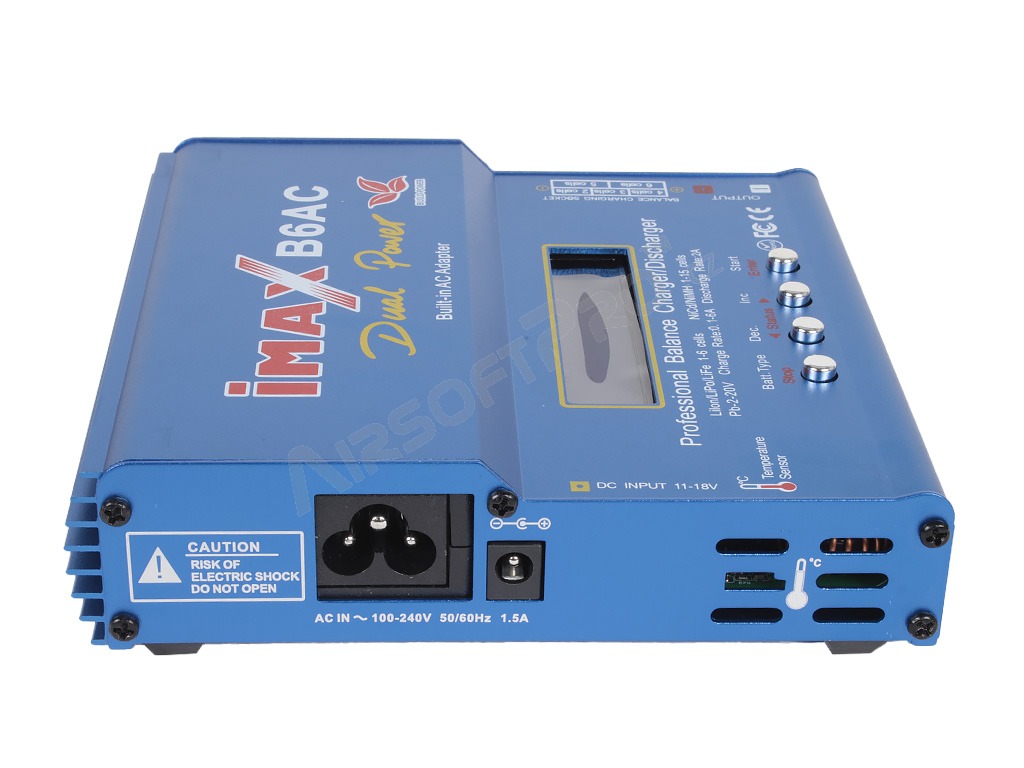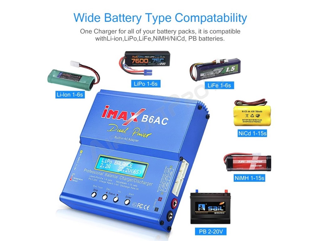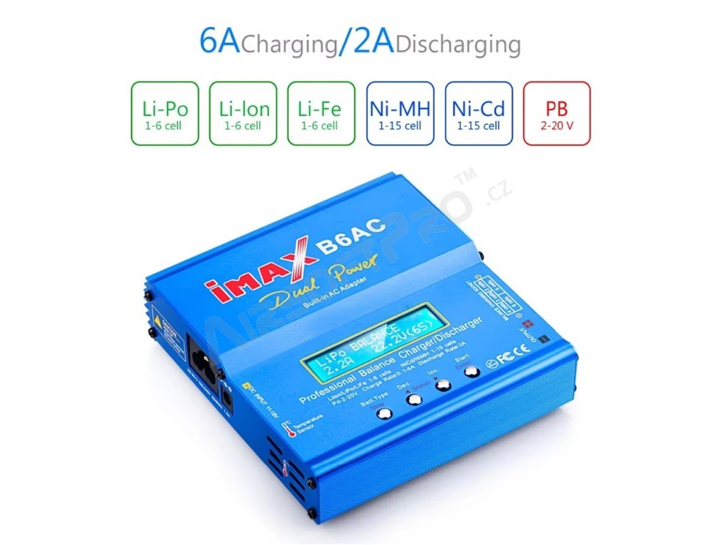 aziMax B6AC egy kiváló minőségű, akár 80 W teljesítményű processzoros töltő, amelyet Ni-Cd, Ni-MH, Li-Po, Li-Ion, Li-Fe vagy Pb akkumulátorok töltésére terveztek.