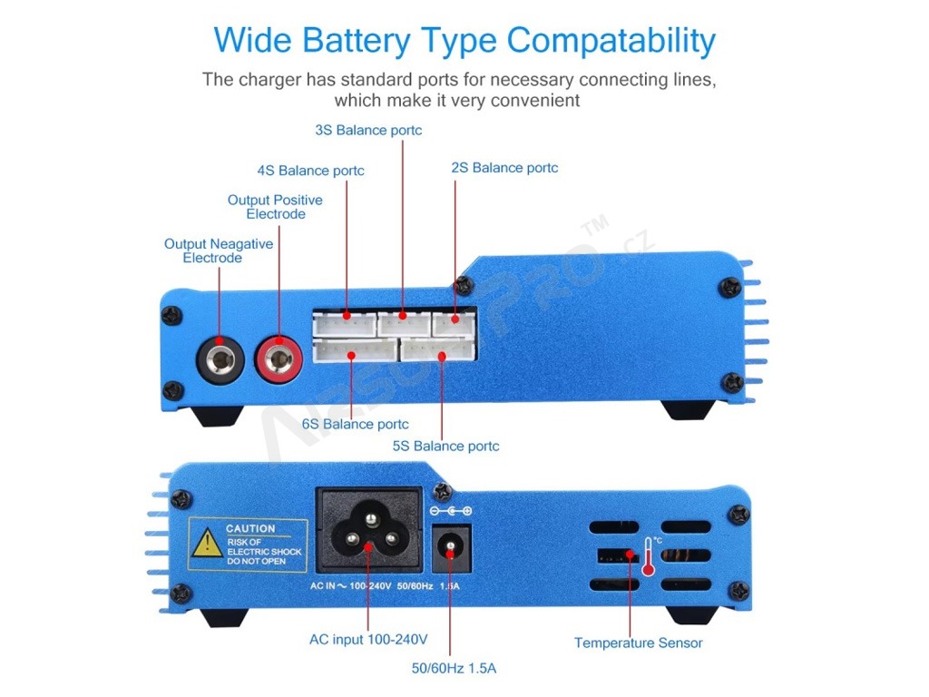 - Ni-Cd, Ni-MH, Li-Po, Li-Lo, Li-Fe, Pb akkumulátorok támogatása