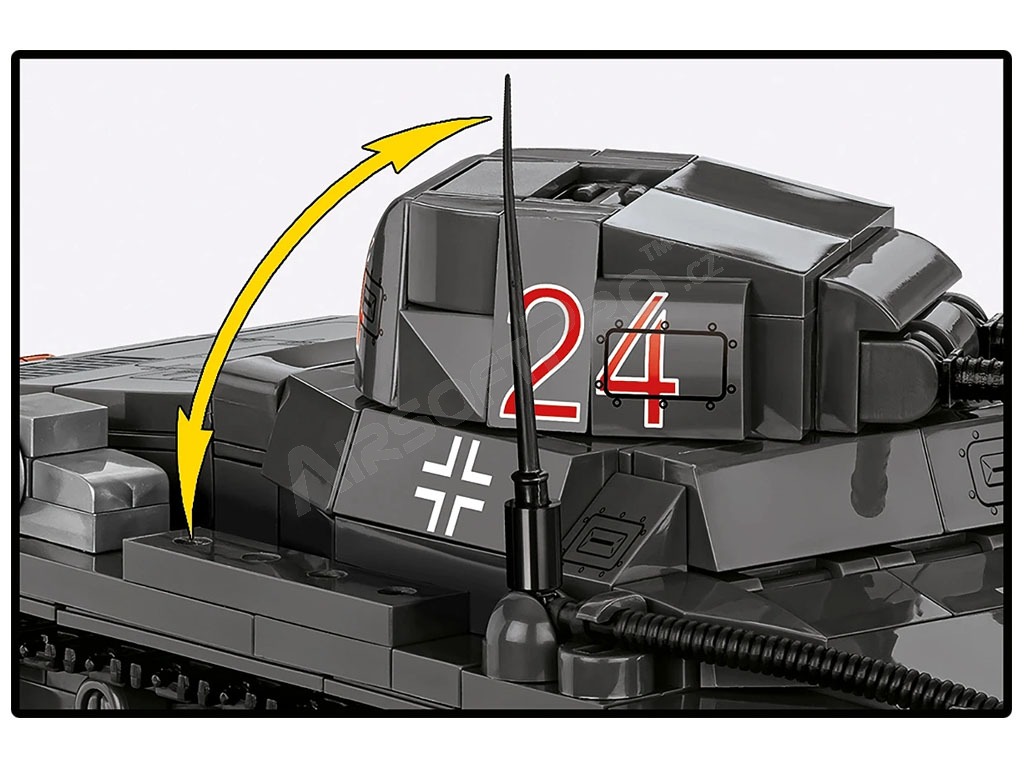 - A torony 360°-ban forog, és a lövegcső szöget változtat, így a modell számos valósághű pozícióba helyezhető.