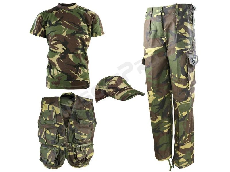 Tökéletes választás a kis felfedezőknek! A Kids Adventurer szett egy teljes felszerelést tartalmaz DPM (Disruptive Pattern Material - a Woodland mintához hasonló) anyagból - ideális szabadtéri játékokhoz, kempingezéshez vagy airsofthoz.