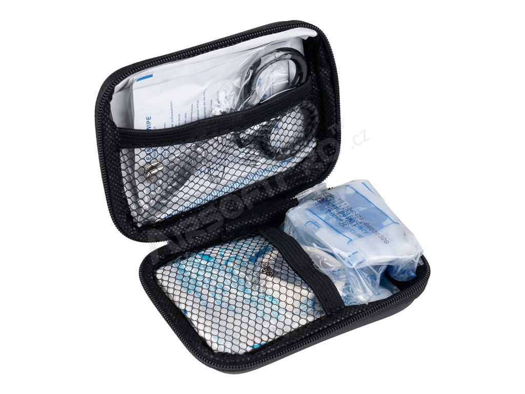 A kötszerek, tapaszok és egyéb szükséges segédeszközök egy szilárd műanyag (polikarbonát) dobozban vannak tárolva, amely a jobb rendszerezés érdekében elválasztókkal van ellátva. A doboz kompakt és nem foglal sok helyet. Bármilyen hátizsákban vagy táskában talál helyet.