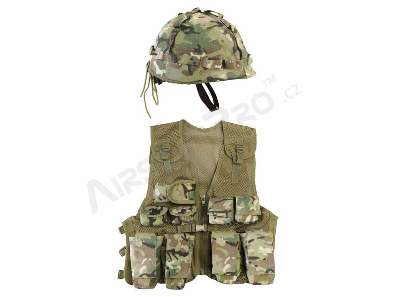Tökéletes választás a kis felfedezőknek! A Kids Set tartalmaz egy gyerek támadó mellényt és sisakot BTP (British Terrain Pattern) terepszínű álcázó borítással - ideális szabadtéri játékokhoz vagy airsofthoz.