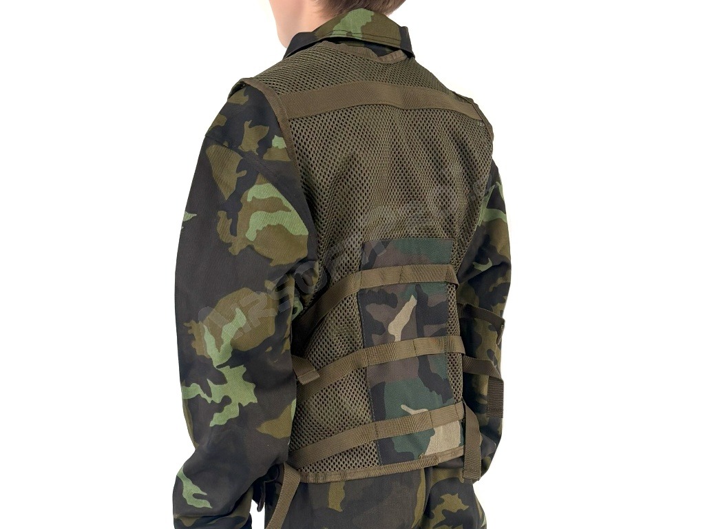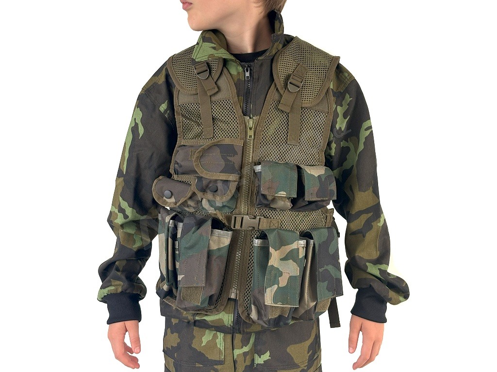 Gyerek támadó mellény - Woodland [Fosco] Gyermek taktikai mellény magazinokhoz és kiegészítőkhöz. 100% poliészterből készült, terepszínű mintával. Elöl négy dupla tasak található az M4-es tárak számára. Fölöttük kisebb zsebek vannak egyéb kiegészítők számára. Mindegyik tépőzárral záródik. A mellény a középső hátsó rész kivételével hálóból készült. A vállpántok állíthatóak. A kerület a húzózsinóros pántokkal állítható. A derékkörfogat 64 cm és 88 cm között állítható. A mellényt masszív cipzárral zárjuk, és műanyag csattal rögzítjük.