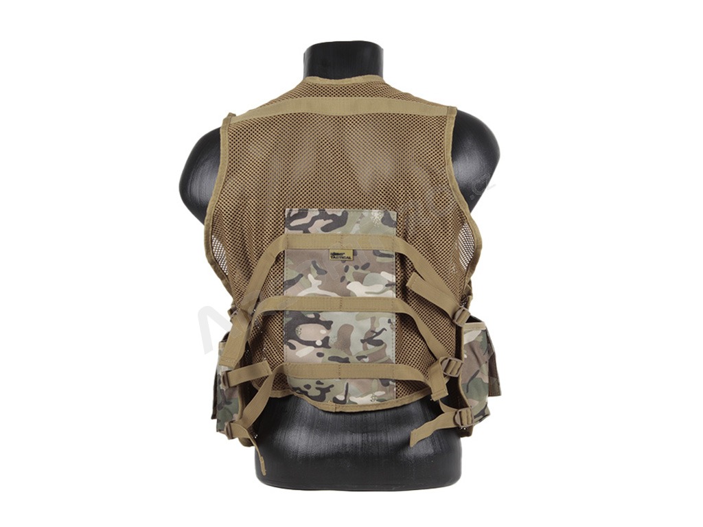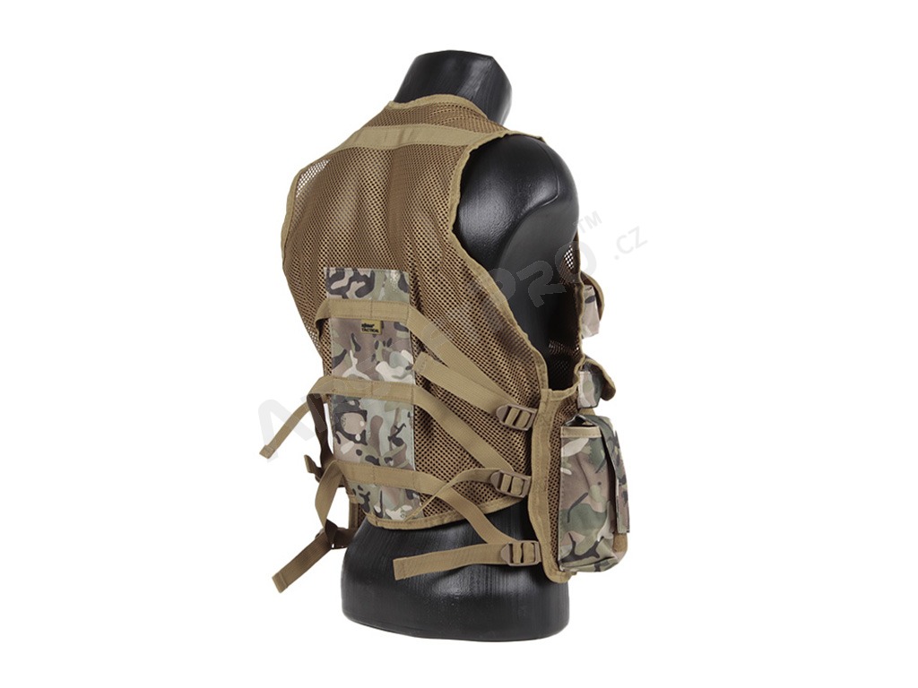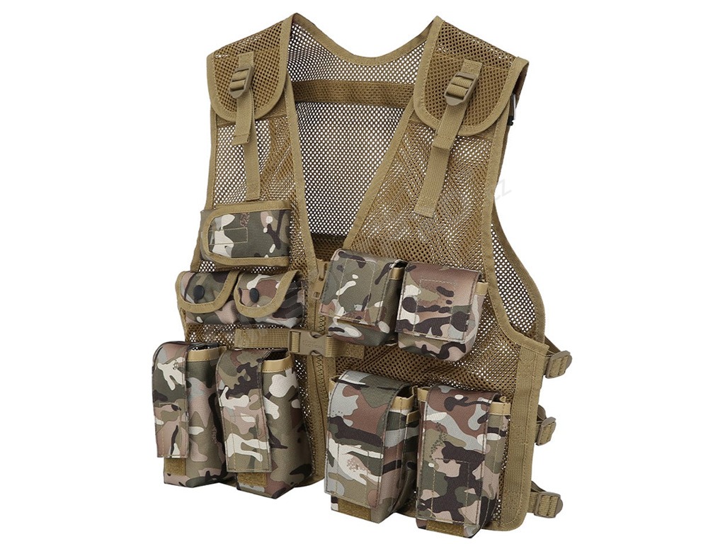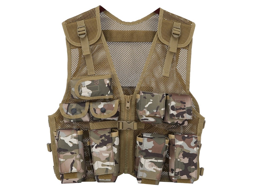 Könnyű, légáteresztő hálós anyagból készült, állítható pántokkal a vállakon, elöl és az oldalakon. Gyorskioldó csattal ellátott cipzárral és 9 zsebbel rendelkezik az elején. A mellény 600D Tac-Poly anyagból készült, így erős és tartós, és univerzális méretű.
