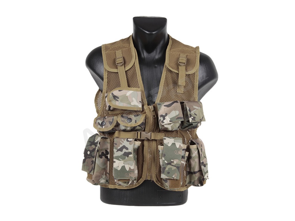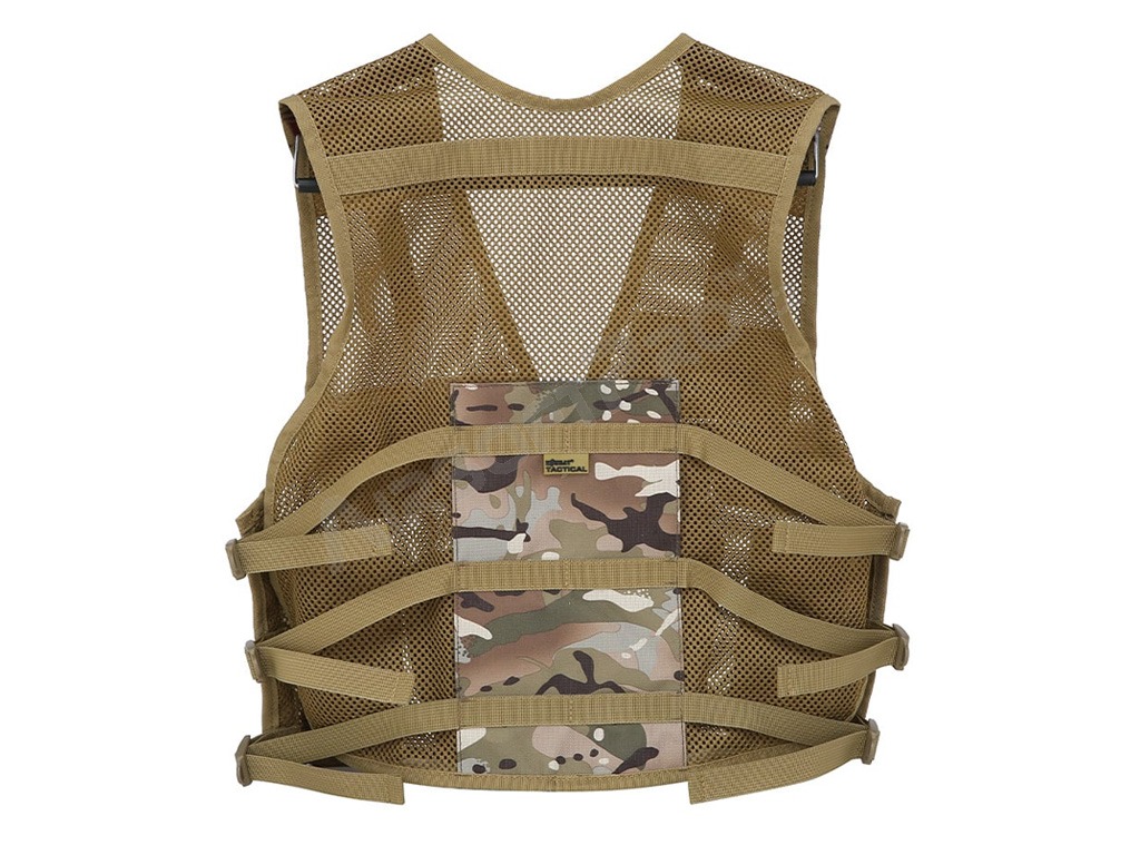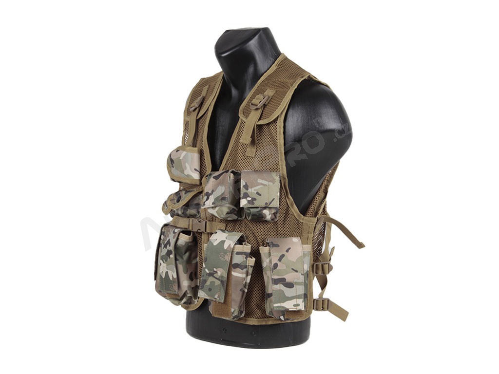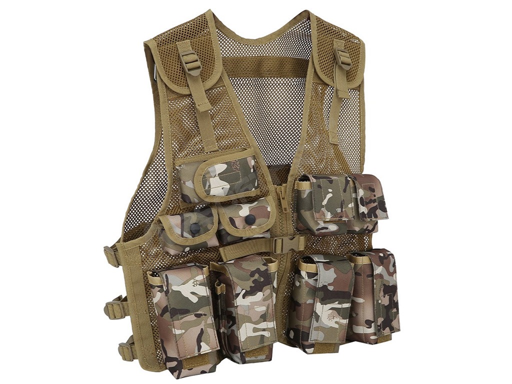 Könnyű, légáteresztő hálós anyagból készült, állítható pántokkal a vállakon, elöl és az oldalakon. Gyorskioldó csattal ellátott cipzárral és 9 zsebbel rendelkezik az elején. A mellény 600D Tac-Poly anyagból készült, így erős és tartós, és univerzális méretű.