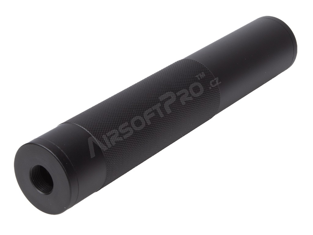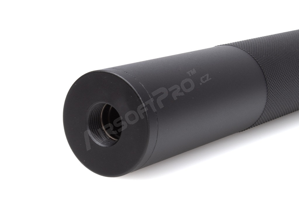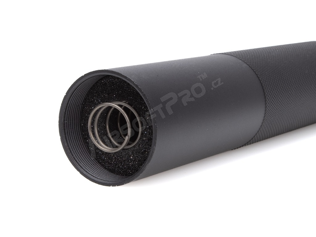 Univerzális fém (alumínium) lengéscsillapító kétoldali menettel - bal oldali 14 mm az egyik oldalon és jobb oldali 14 mm a másik oldalon. Ez a kombináció kompatibilissé teszi a legtöbb levehető lángszűrővel ellátott airsoft fegyverrel.