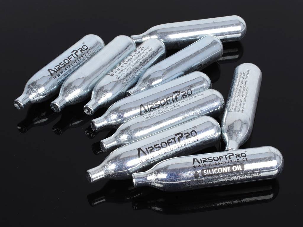 AirsoftPro tíz darab 12 grammos CO2-bombából álló készlet. A készlet 9 klasszikus és 1 szilikonolajjal ellátott patronból áll.