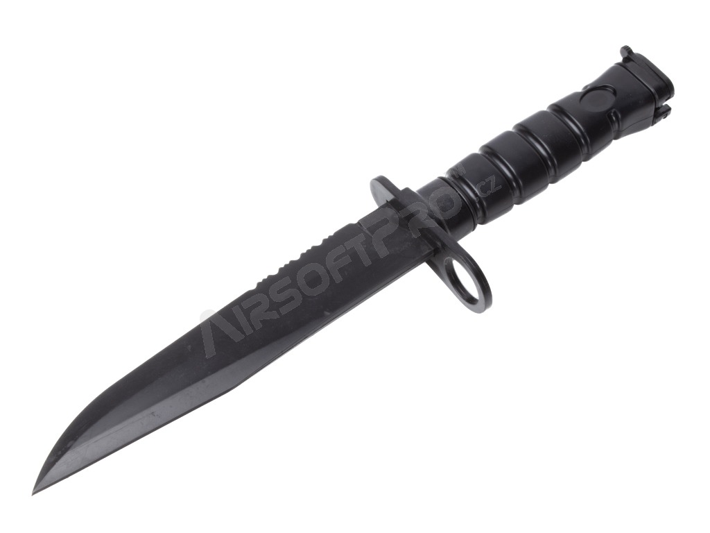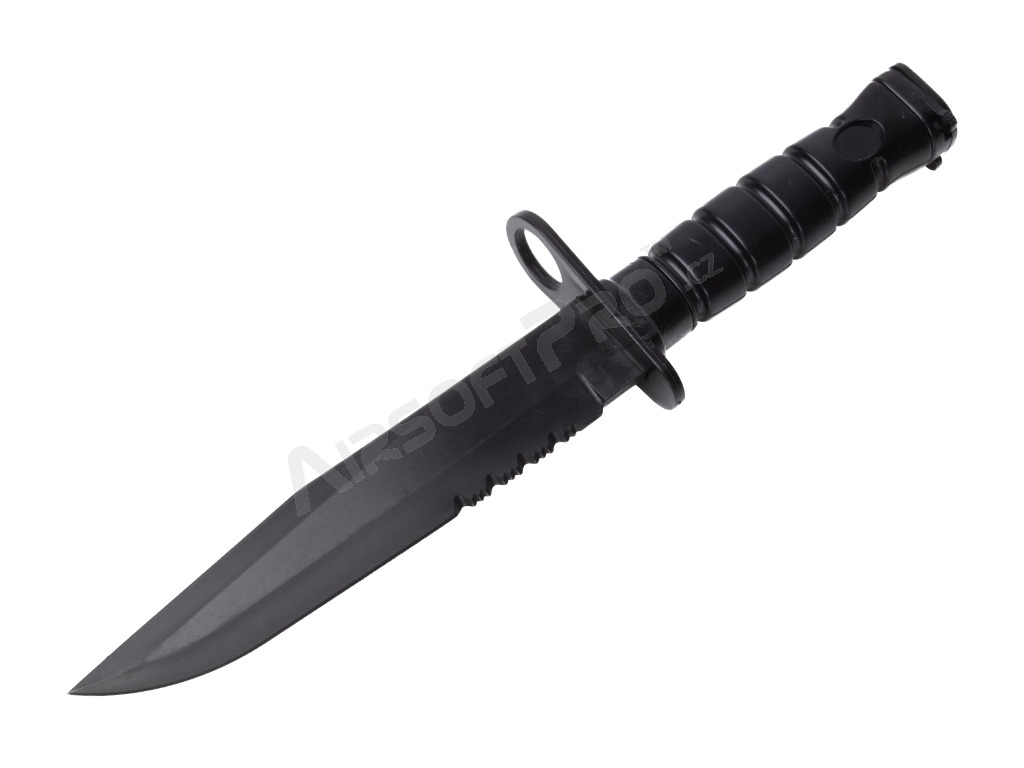 M10 taktikai harci kés/bajonett valósághű másolata tipikus műanyag hüvelyben. Ez a biztonságos gyakorló kés gumipengével ideális airsoft használatra, a közeli technikák gyakorlásához vagy a felszerelésed stílusos kiegészítőjeként.