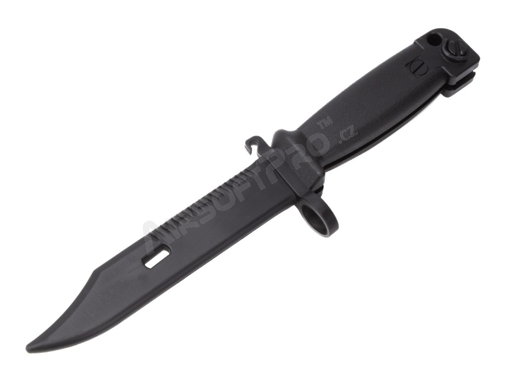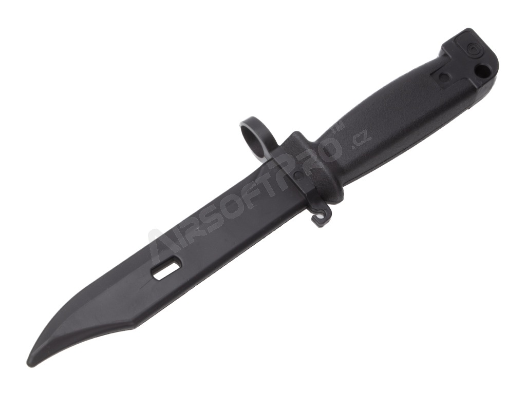 A rugalmas gumiból készültpuha penge több mint 90°-ban elhajlik, így a bajonett biztonságos. A markolat tartós polimerből készült. A bajonett egy lyukkal is rendelkezik, amelybe szíjat vagy biztosítókötelet lehet rögzíteni.