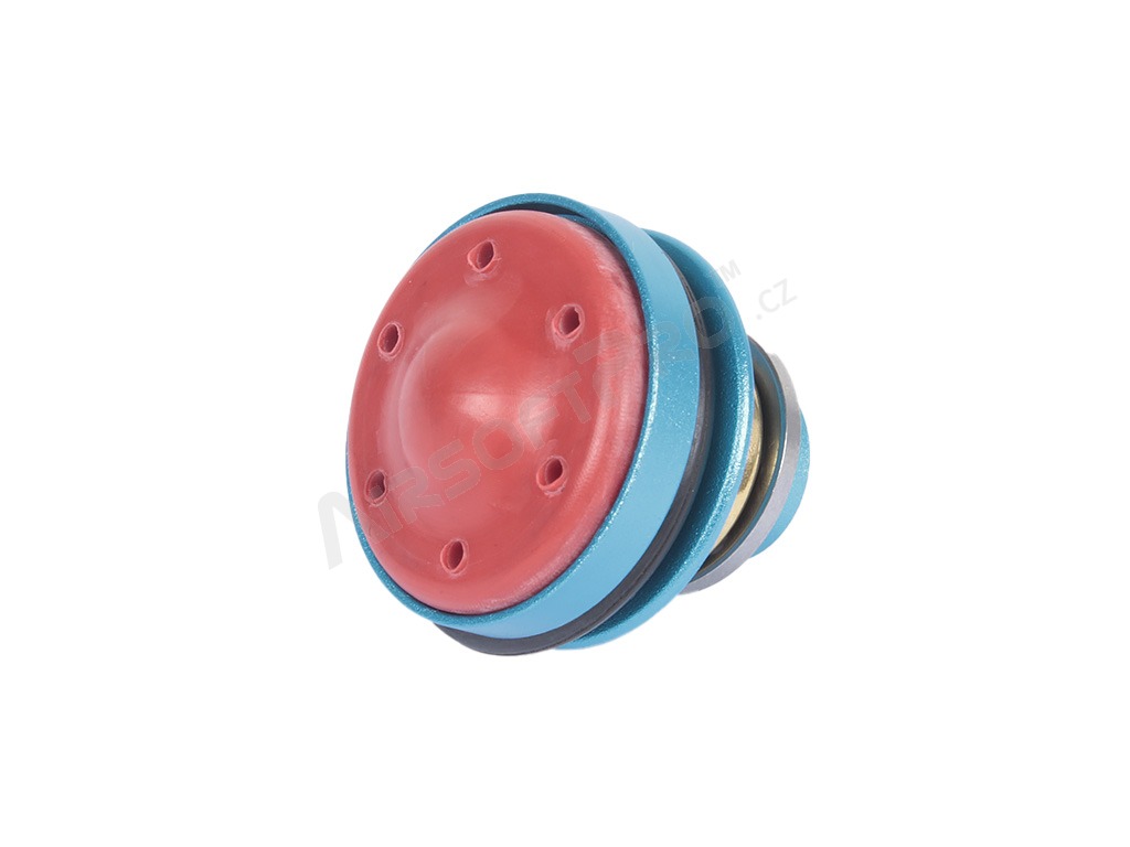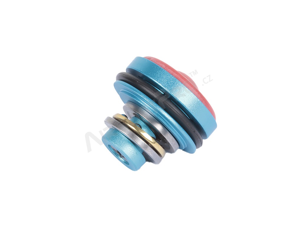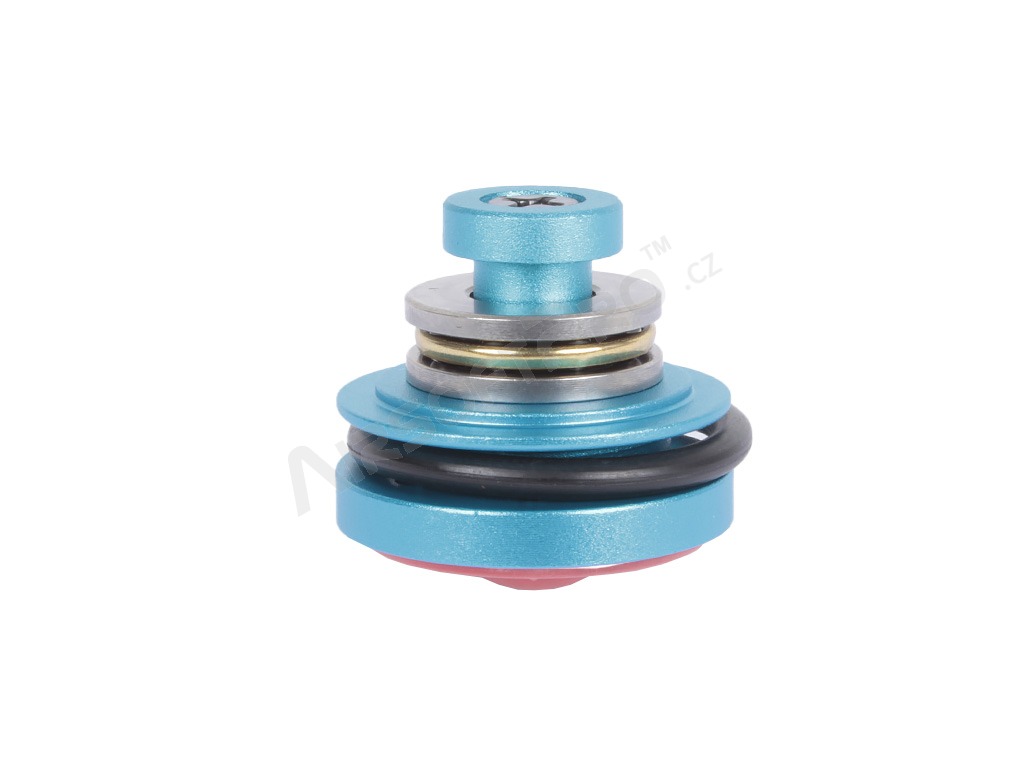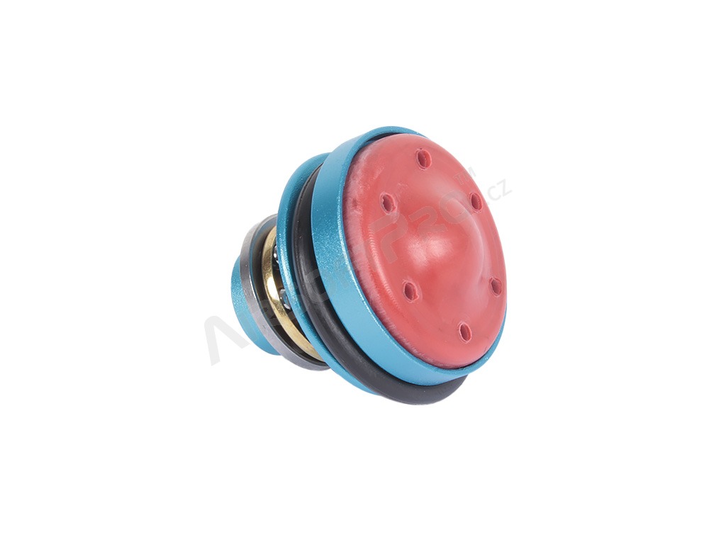 Alumínium dugattyúfej nyomásgátló funkcióval és csapágyazással, airsoft fegyverek korszerűsítésére tervezve. A CNC megmunkálásnak köszönhetően pontos méretekkel és nagyobb tartóssággal rendelkezik a hagyományos műanyag alkatrészekhez képest (14 g).