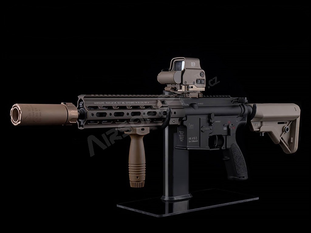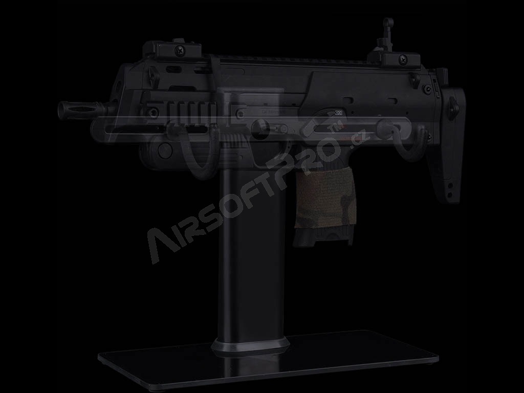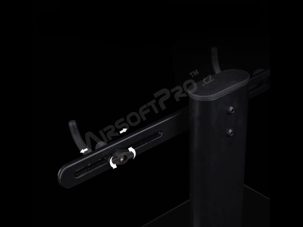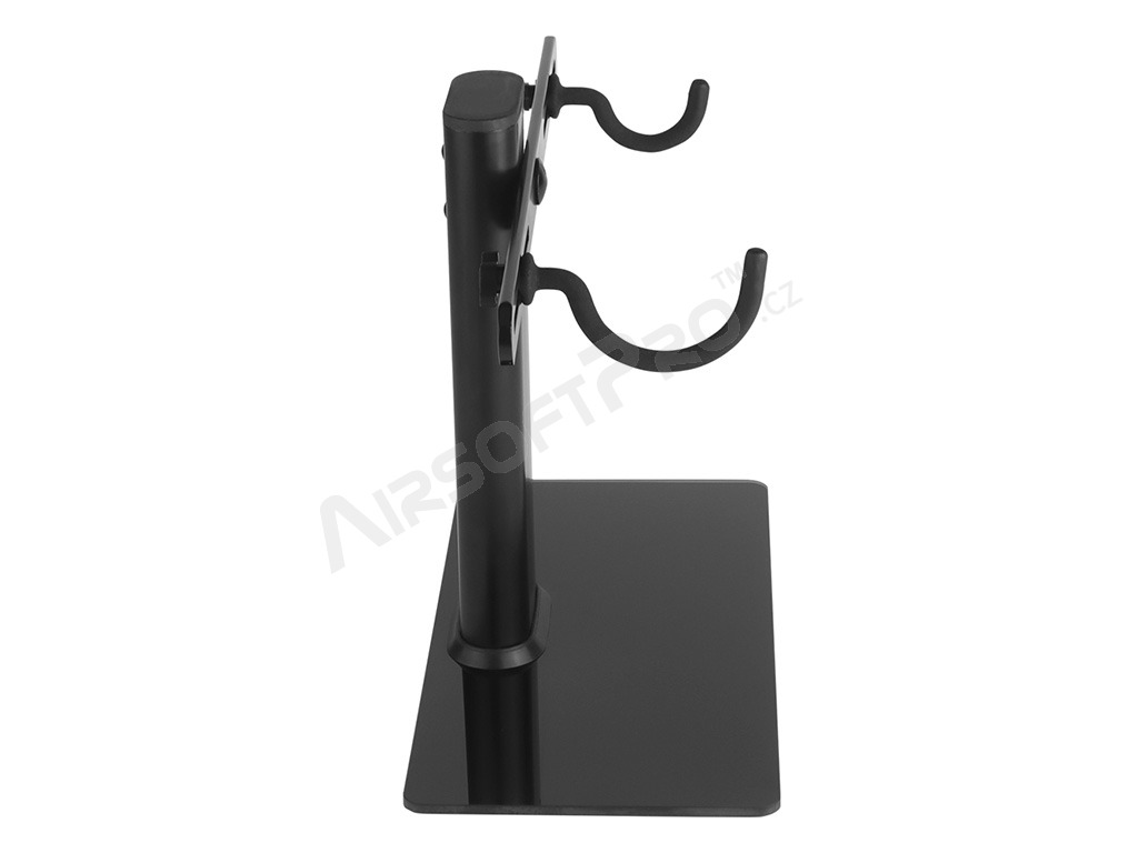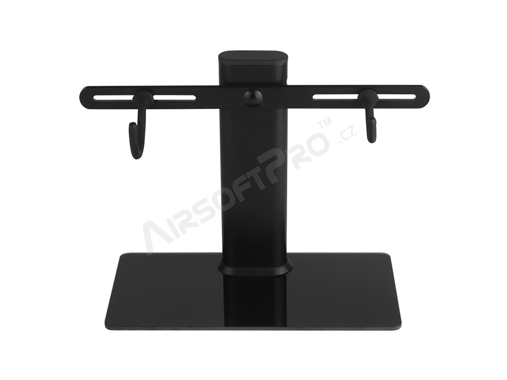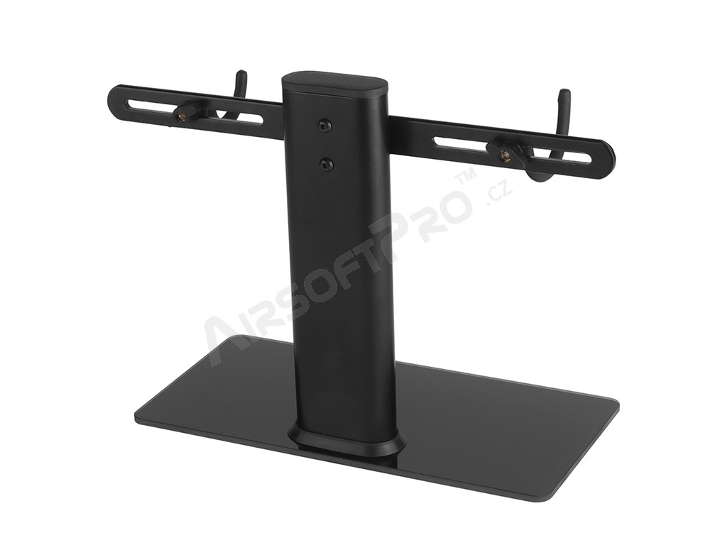 Az állvány két gumírozott kampót használ a fegyver megtartására. Az állvány 5 különböző horogformát tartalmaz, így az állvány alkalmas a hosszúfegyverek túlnyomó többségéhez. Az állvány karja elforgatható, hogy vizuálisan hatásos pozíciókat érjen el a kiállított fegyver számára. Ezenkívül az üveg talapzat elegánsan kiemeli a kiállított puska megjelenését.