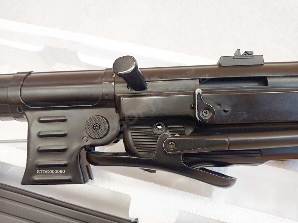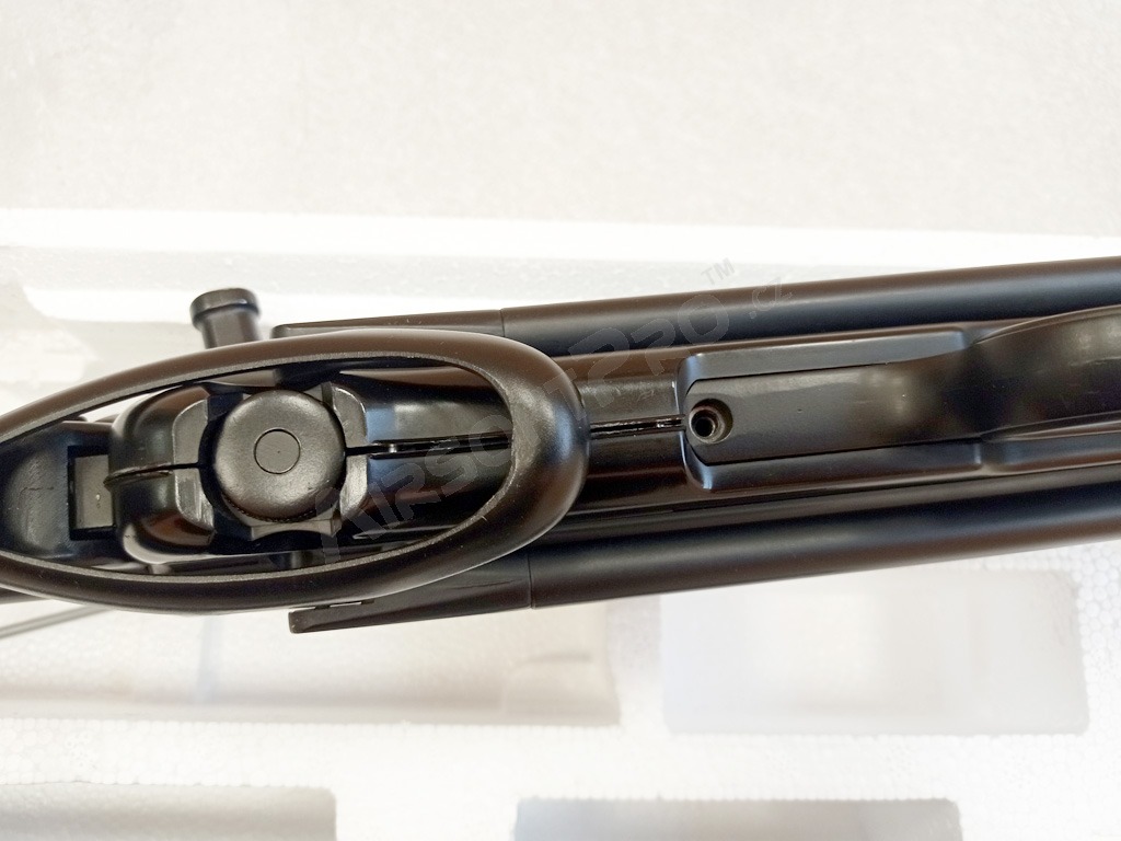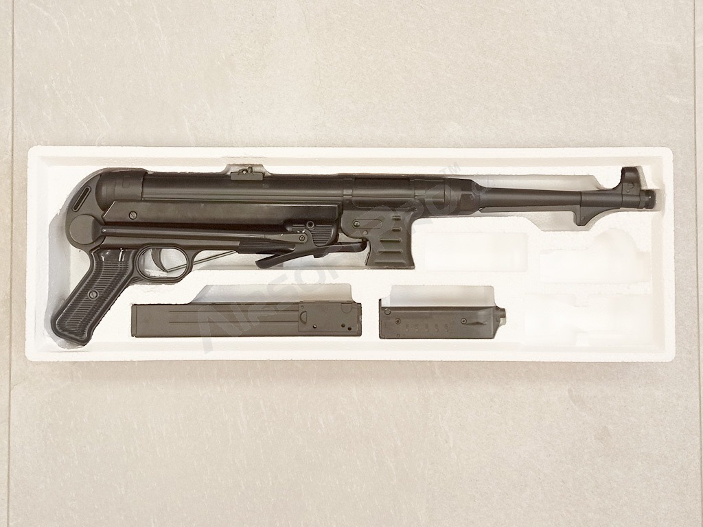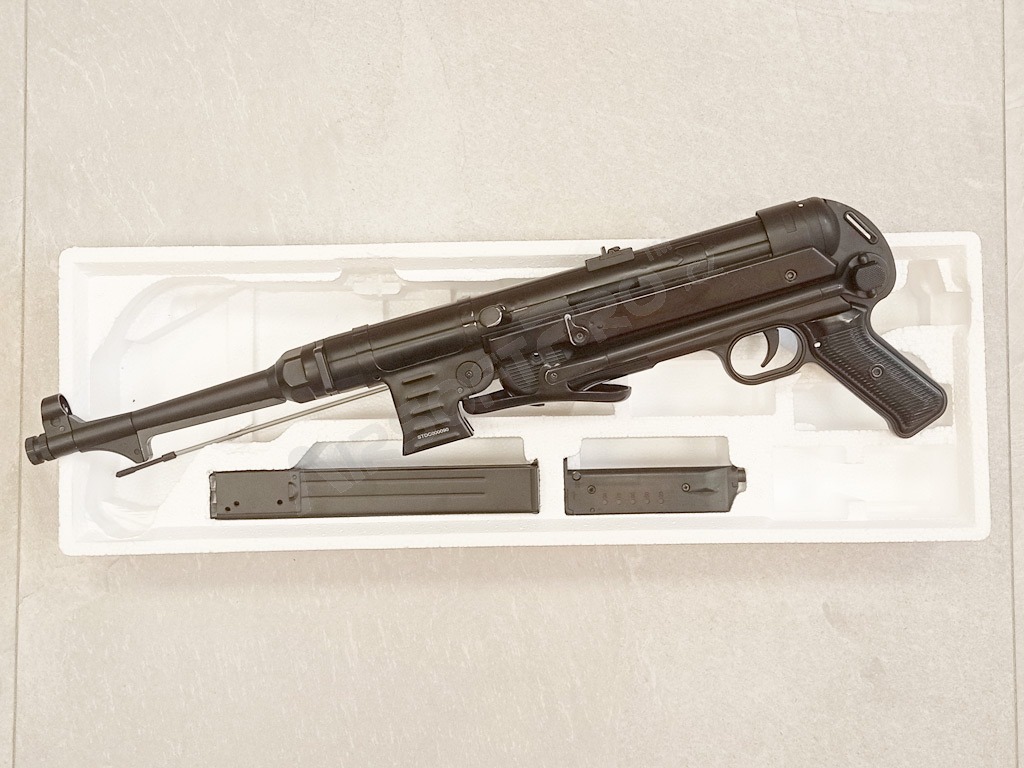 Második háborús német klasszikus - MP40 Schmeisser. Ez a nagyon jól sikerült teljes fém replika összecsukható készlettel és fekete fenéklemezzel rendelkezik. Az airsoft pisztoly elektromos és képes egyszeri és sorozatlövésre is.