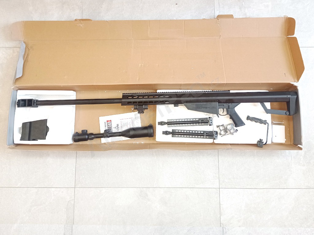 A híres M82 A1 Barrett mesterlövészpuska másolata. Ez a fegyver AEG (elektromos) változata. A test és a cső fémből készült, ami a fegyvernek tisztességes, 5 kg-os súlyt és tartósságot biztosít. A cső végén lévő kompenzátor ABS műanyagból készült. A szár fenékrészét gumírozták a vállról való lecsúszás ellen. A bipod acélból készült.