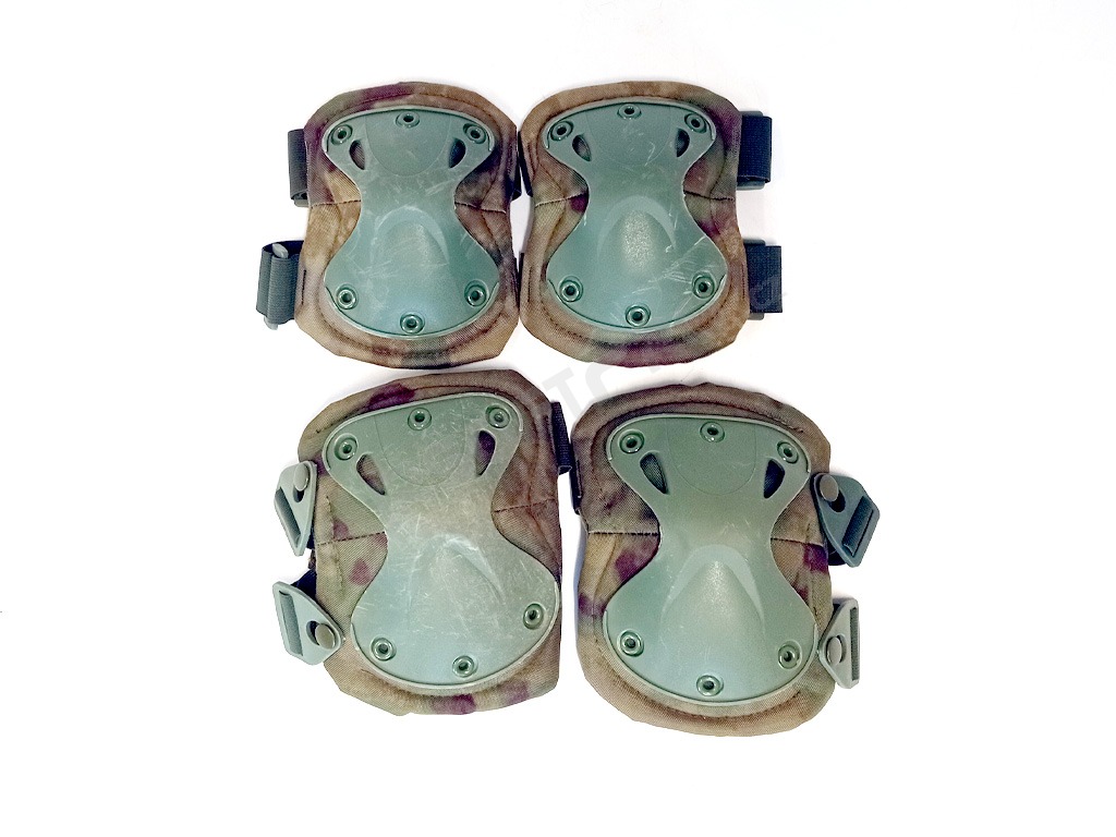 Két térd- és két könyökvédőből álló készlet terepszínű mintával, tépőzáras rögzítéssel.