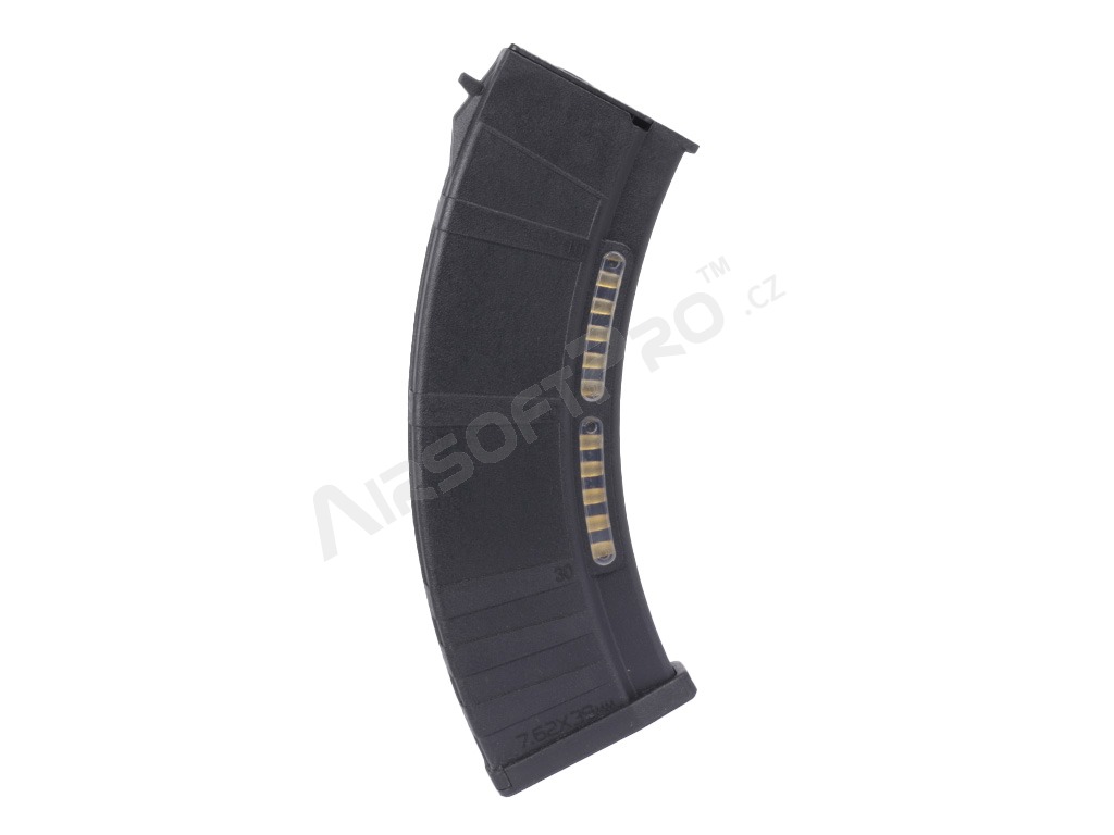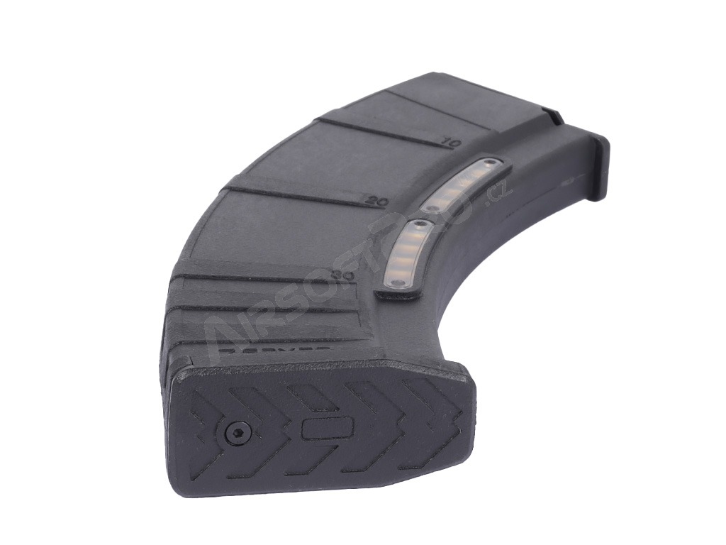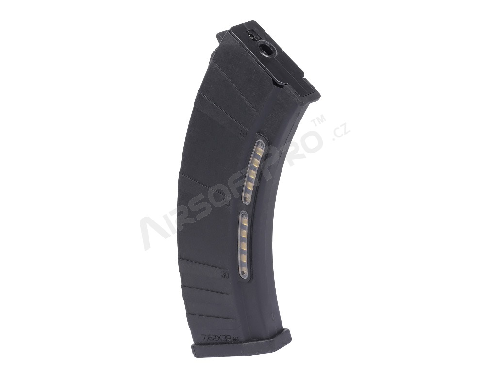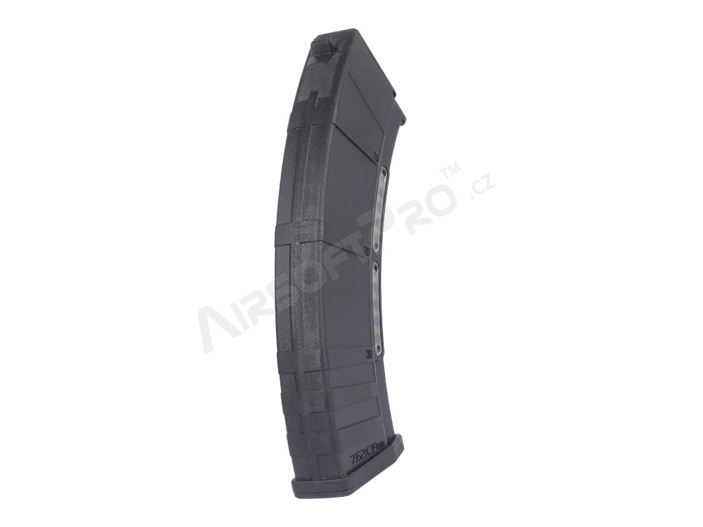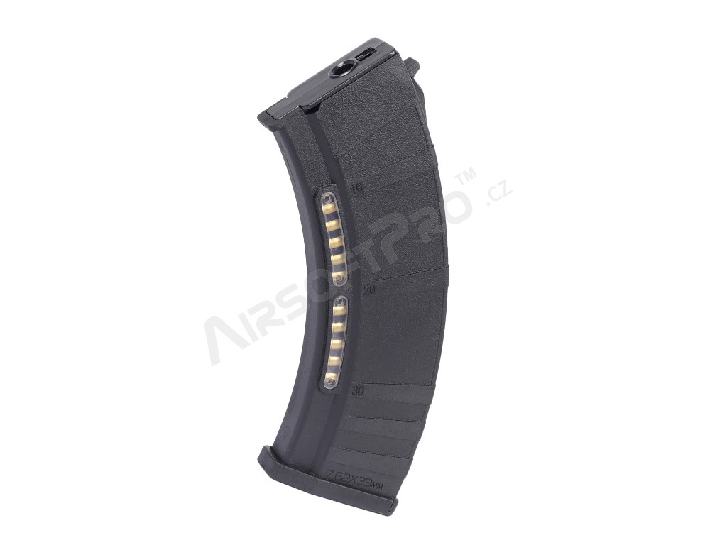 Ergonomikus alakja biztonságos fogást biztosít újratöltés közben. Alkalmas az airsoft elektromos AK-k túlnyomó többségéhez. Tartós műanyagból készült , imitált töltényhüvelyek számára kialakított hézaggal.